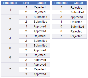 Employees submit weekly time sheets. Each time sheet has time sheet lines. Time sheet line can have one of three statuses: Submitted, Approved and Rejected.