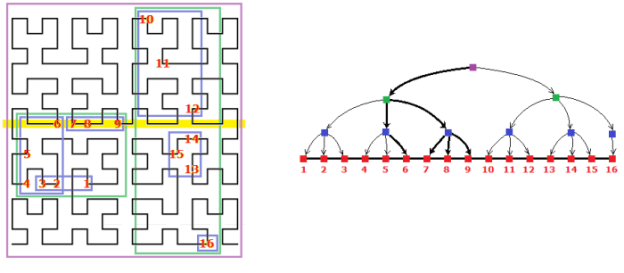 The intuitive reasons why our Hilbert-based methods will result in good performance is that the resulting R-tree nodes tend to be small square-like rectangles. This indicates that the nodes will likely have small area and small perimeters. Small area values result in good performance for point queries; small area and small perimeter values lead to good performance for larger queries. It was also shown experimentally that the Hilbert curve achieves the best clustering among other space filling curves.