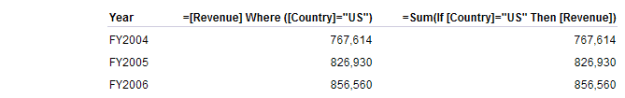 =Sum(If [Country]=”US” Then [Revenue]) ForAll([Country])
