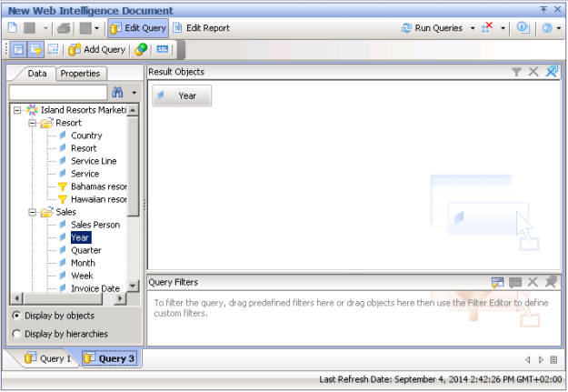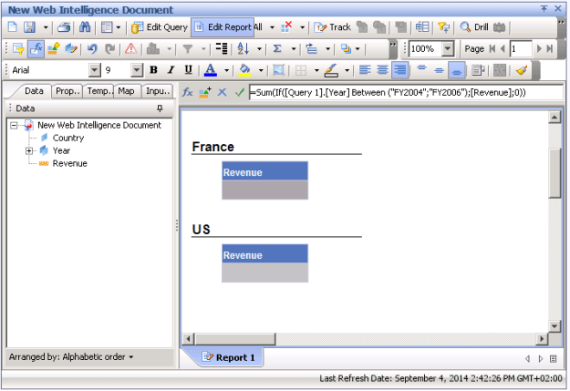 Create a report that contains 3 objects: Country, Year, Revenue